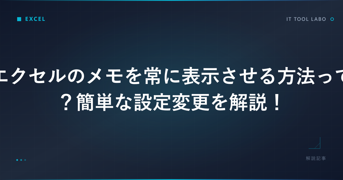 ここではエクセルのメモを常に表示させるための基本設定について説明していきます。エクセルのバージョンによって呼び名が異なることもありますが、基本的には黄色い付箋のようなメモ機能を中心に解説を進めます。常に表示させることで、見落としを防ぎ、作業の効率化が図れるはずです。また、意図せず表示されてしまう場合の対処法や、一括で編集する方法などもあわせて確認しておくと便利でしょう。順に見ていきましょう。