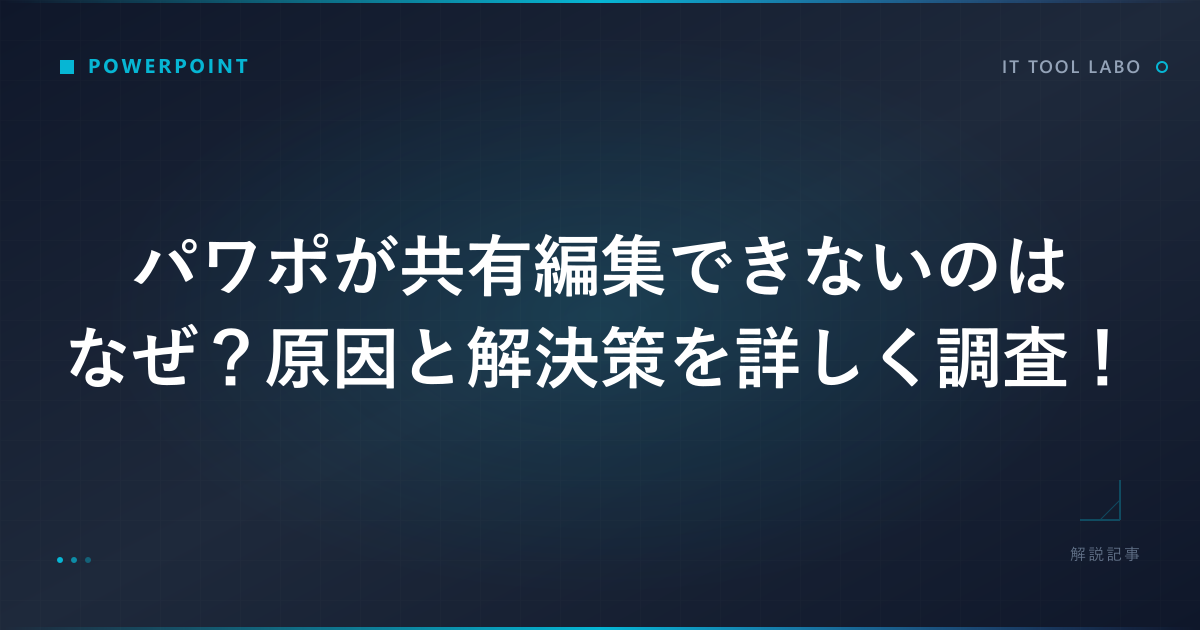 こんにちは。ITツールラボ、運営者のNです。PowerPointで複数人とファイルを共同編集しようとしたとき、なぜか共有編集ができない状況に遭遇した経験はありませんか?チームで資料作成を進めたいのに、一人ずつしか編集できなかったり、そもそも共有自体がうまくいかなかったりすると、作業効率が大幅に下がってしまいます。この記事では、パワポが共有編集できない原因について詳しく調査し、具体的な解決方法をまとめました。権限設定やファイル形式の違い、ネットワーク環境の影響など、様々な要因を理解することで、スムーズな共同作業環境を整えることができるはずです。