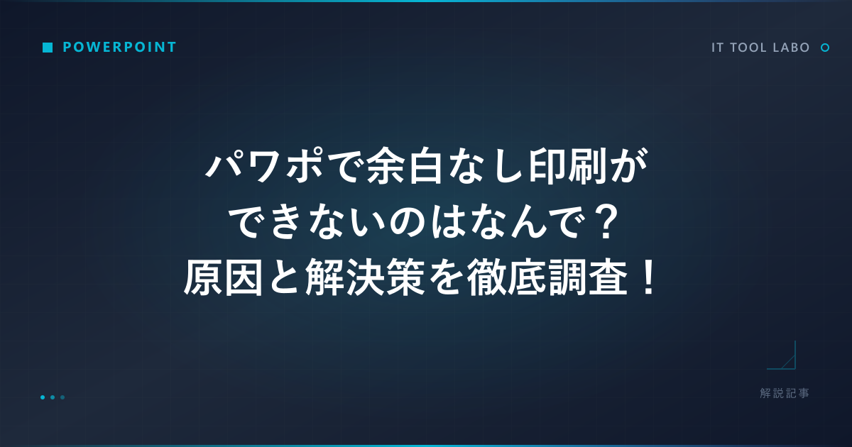 パワーポイント(パワポ)で作成した資料を印刷しようとした際、スライドの周囲に意図しない余白ができてしまい、困った経験はありませんか。デザインの端までしっかり印刷したい、あるいは用紙いっぱいに情報を掲載したいと思っても、なぜか白フチが残ってしまう。パワポで余白なし印刷を試みてもできないという状況は、プレゼン資料や配布物の見栄えにこだわる方にとって、大きなストレス要因となるかもしれません。この問題は、パワーポイントで用紙いっぱいに印刷したいと考える多くの利用者が直面する可能性のある、一般的な課題の一つと言えるでしょう。単なる設定ミスなのか、それとも何か根本的な原因があるのか、その理由は一つではないかもしれません。この記事では、パワポで余白なし印刷ができないのはなぜなのか、その原因を多角的に調査し、考えられる解決策やアプローチを詳しくご紹介していきます。