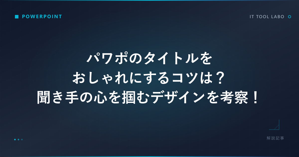 プレゼンテーションの成功は、聴衆の関心をいかに早く掴むかにかかっていると言っても過言ではないかもしれません。その第一印象を決定づけるのが、パワーポイントの「タイトル」です。スライドの顔とも言えるタイトルが、もしありきたりで退屈なものだったら、聞き手は開始早々に興味を失ってしまう可能性も考えられます。逆に、パワポのタイトルがおしゃれで洗練されていれば、それだけでプレゼンテーション全体への期待感が高まることでしょう。