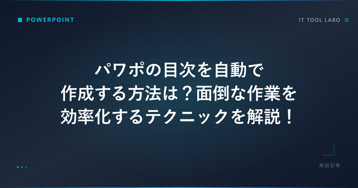 プレゼンテーション資料の作成において、MicrosoftPowerPoint(パワーポイント)は非常に強力なツールです。しかし、スライド枚数が数十枚にも及ぶ大規模な資料になると、全体像を把握しやすくするための「目次」作成が大きな負担になることがあります。