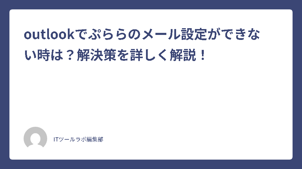 メールソフトの定番であるOutlookを利用して、プロバイダであるぷららのメールを送受信したいと考える方は非常に多くいらっしゃいます。しかし、設定作業を進めていく中で、エラーが表示されてしまい先に進めないというトラブルは後を絶ちません。特にパソコンを買い替えたタイミングなどで、ぷららメール設定をWindows11のOutlookで行おうとした際や、急にぷららメール受信ができない状況にOutlookで陥った時などは、焦りを感じてしまうものです。この記事では、Outlookでぷららのメール設定ができない原因を整理し、具体的な解決策を詳しく解説していきます。初心者の方でも落ち着いて対処できるよう、順を追って説明しますので、ぜひ参考にしてみてください。